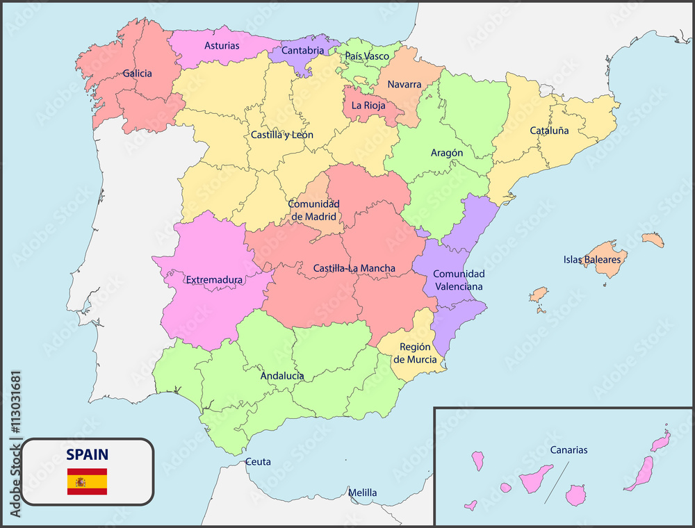Colorful Spain political map with clearly labeled, separated